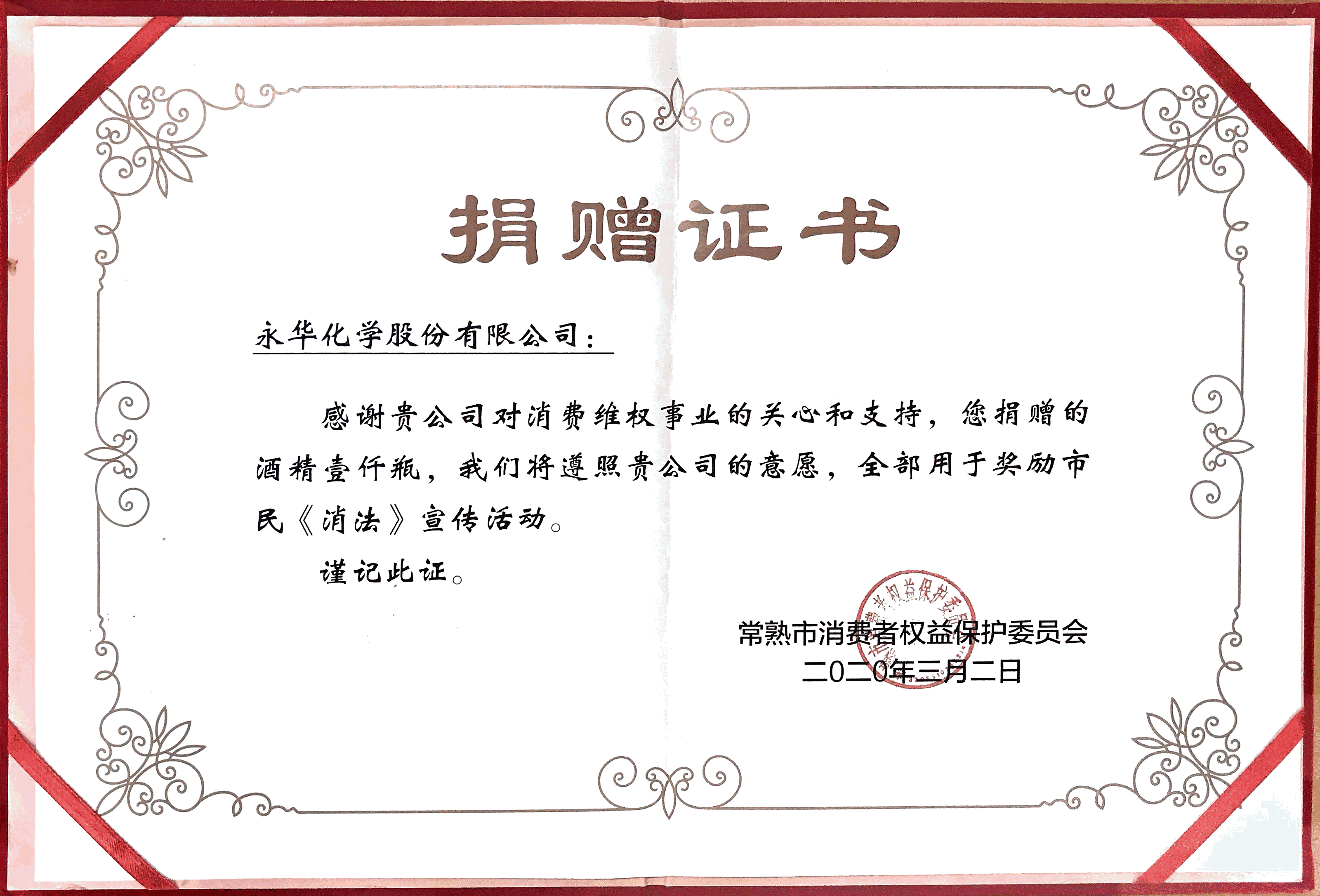 新冠肺炎疫情發(fā)生以來,疫情防控工作牽動著每個人的心。永華一直高度關(guān)注疫情發(fā)展,在按照規(guī)定認(rèn)真做好公司疫情防控和生產(chǎn)經(jīng)營部署的同時,積極踐行社會責(zé)任。我公司向消費(fèi)者權(quán)益保護(hù)委員會捐贈了一千瓶酒精,用于獎勵市民《消法》宣傳活動。