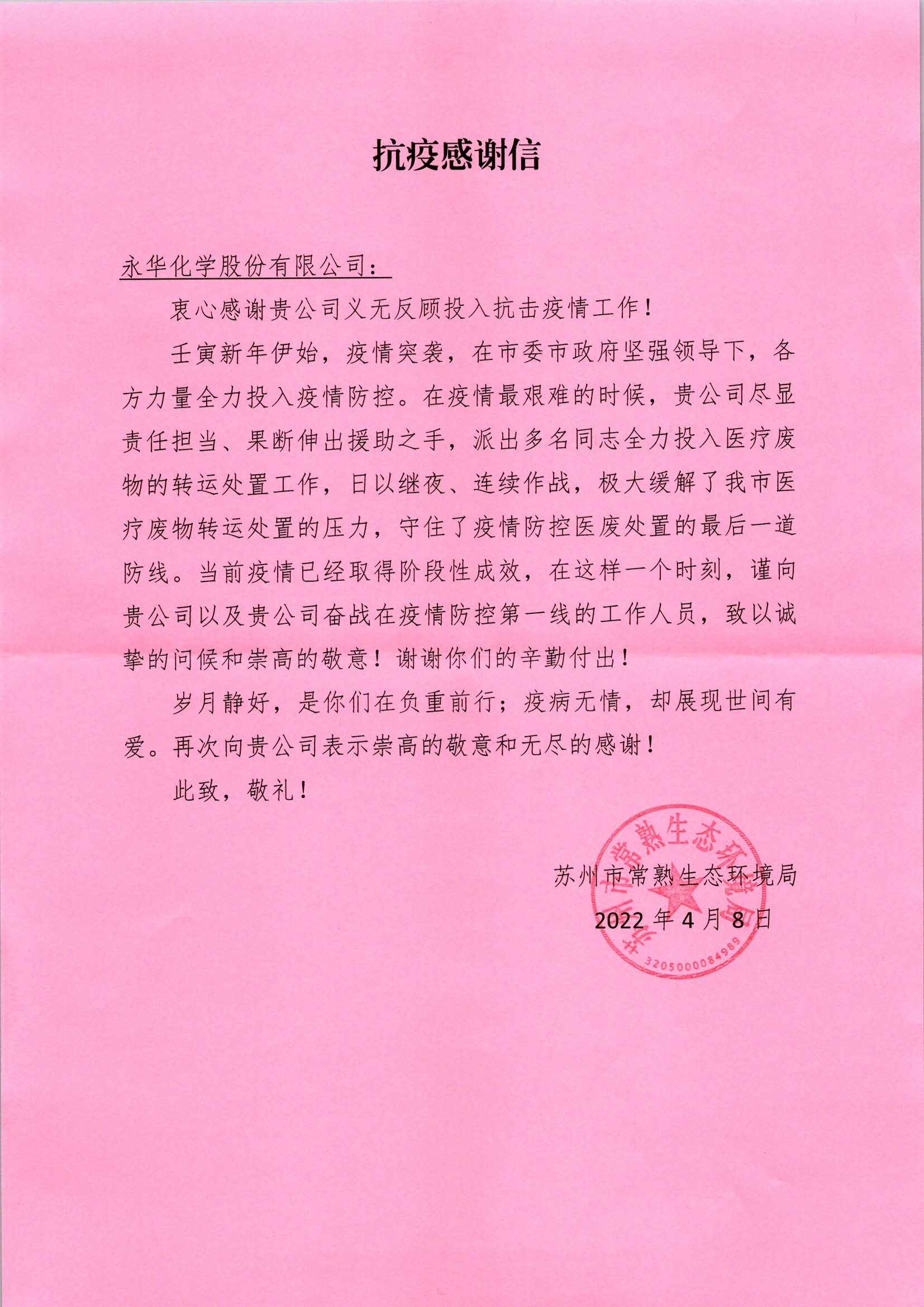 4月8日,我司收到了一封來自蘇州市常熟生態(tài)環(huán)境局的一封感謝信,感謝我司在疫情最艱難的時候,伸出援助之手,緩解了我市醫(yī)療廢物轉(zhuǎn)運處置的壓力。