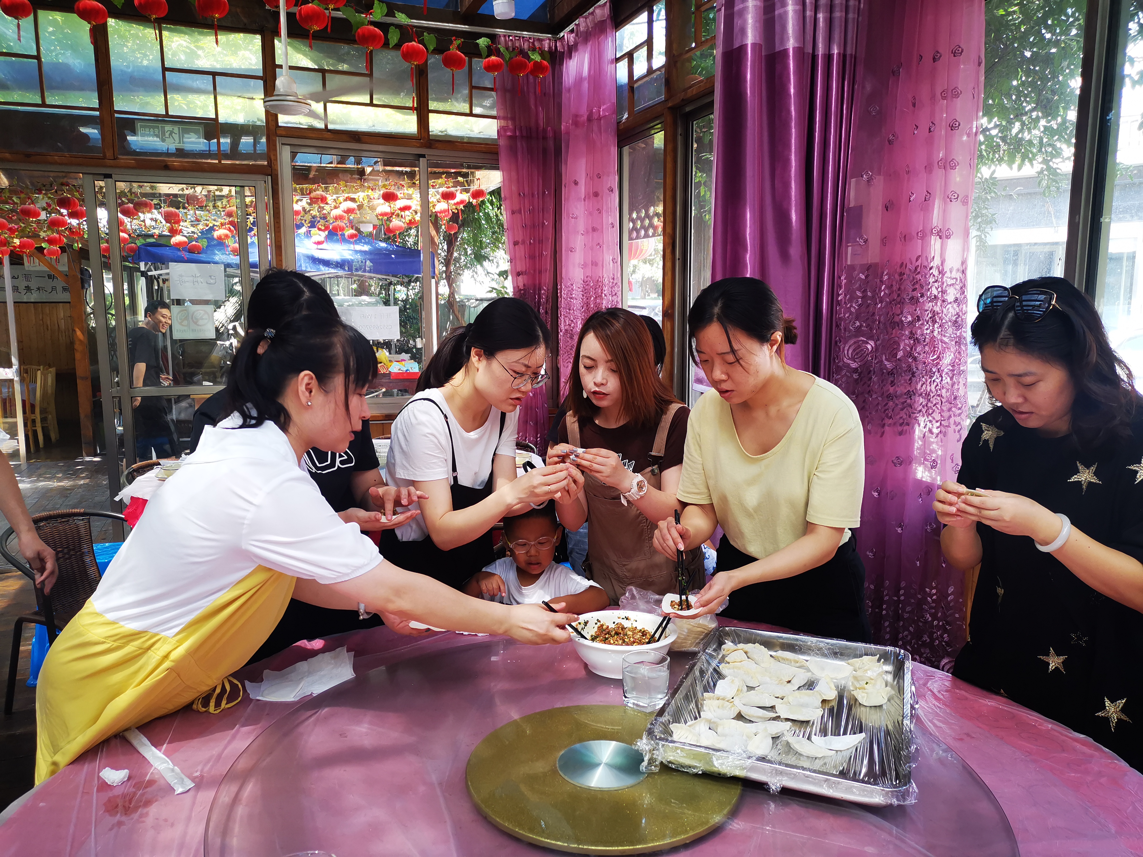 還有一部分人留在茶室,一起包餃子。茶室老板早早的準備了餡料、餃子皮,各個部門的同事也都躍躍欲試,各顯本事。不會包的同事也不忘認真請教,不過一會就已經(jīng)學(xué)會了。一只只餃子就這樣從大家的巧手中捏出來了,擺滿了一桌。