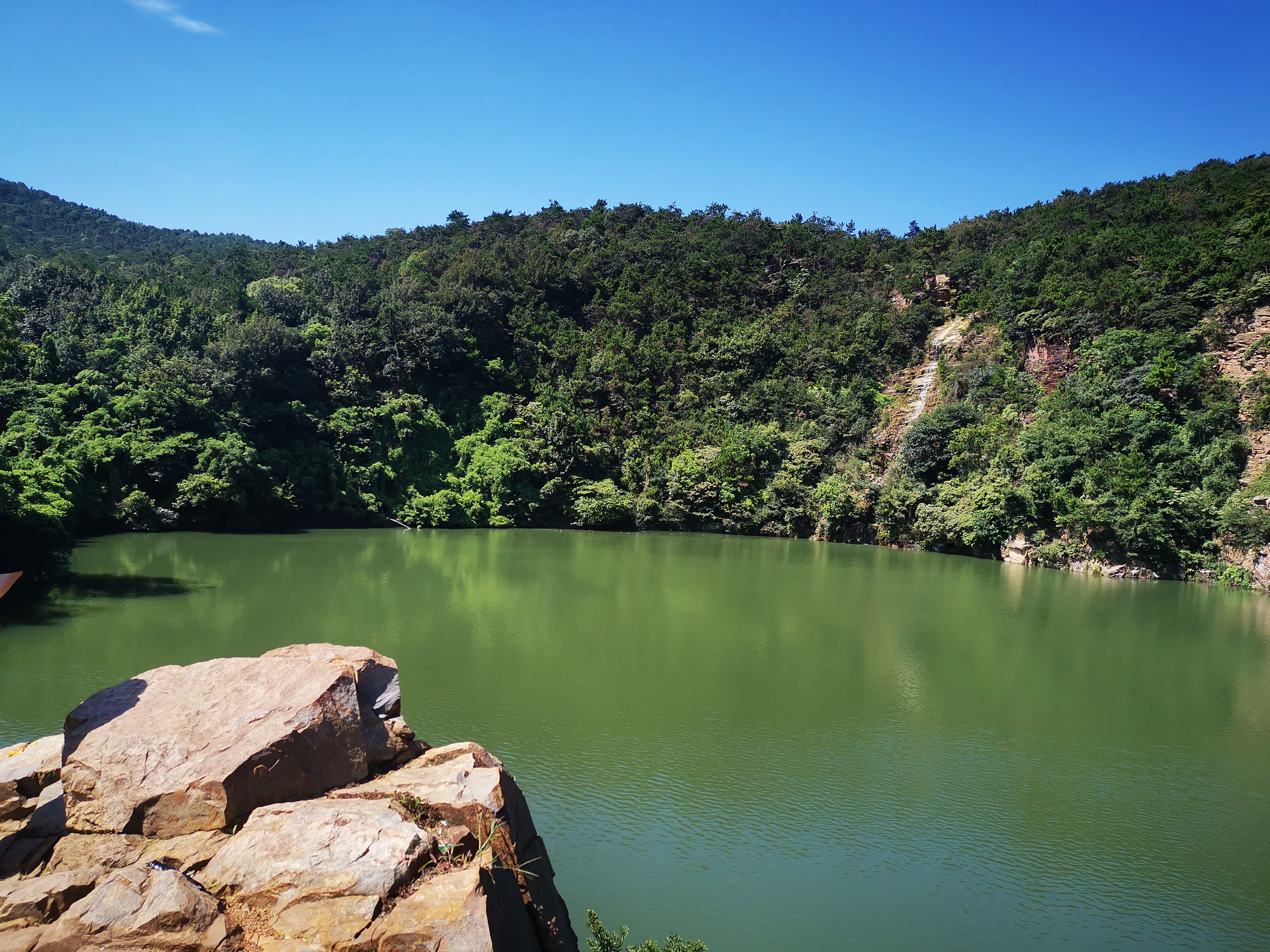 在當?shù)鼐用竦闹敢拢覀冏吡艘粭l小路,爬上石坡往下俯瞰,一幽清潭宛如一塊寶石,晶瑩透亮,沒有一絲雜質(zhì)。龍?zhí)端闹苌狡律隙际鞘[綠的樹木,遠處還能看見一處瀑布,陽光投射到碧綠的潭水上,波光粼粼。聽說潭水深將近100米,提醒大家觀賞的時候一定要注意安全哦!